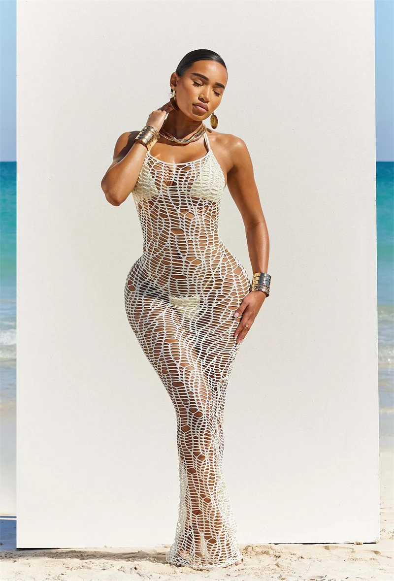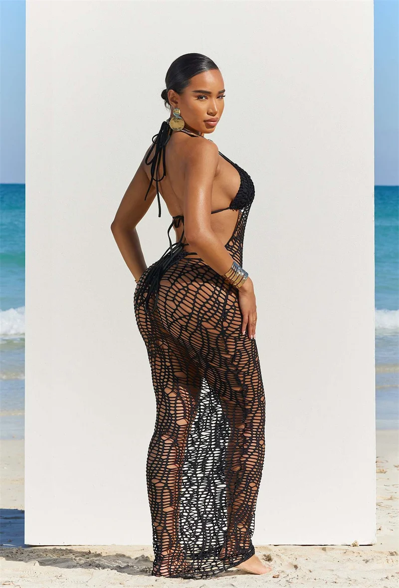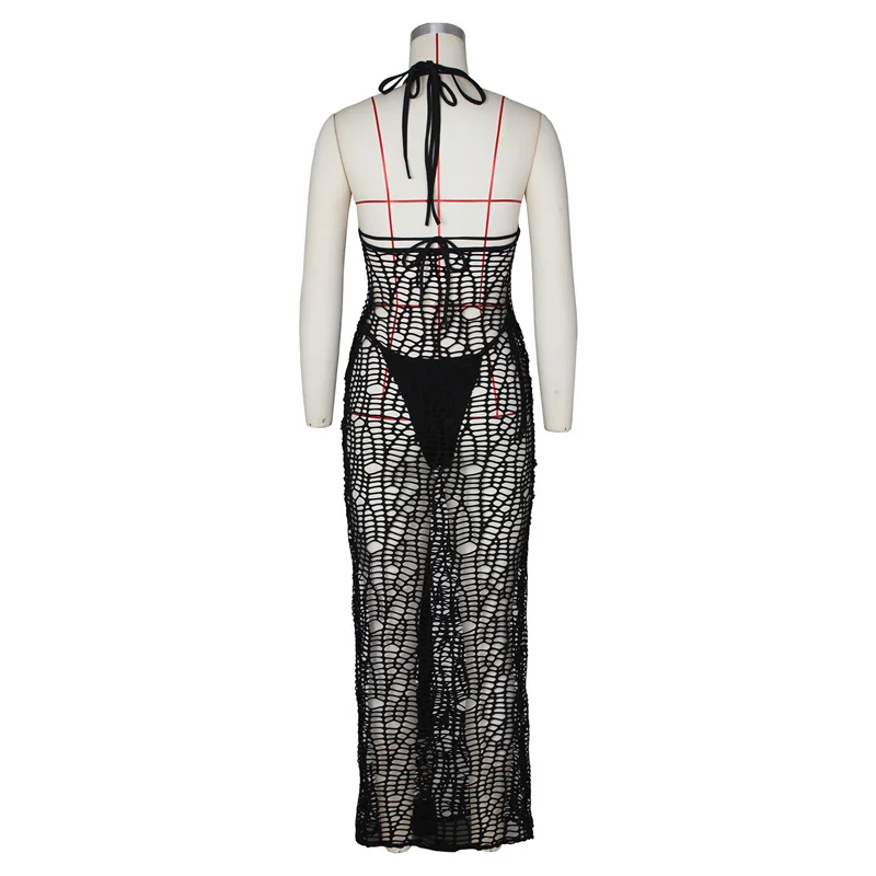 Women 3 Pieces Sexy Beach Bikini Set Backless Hollow Out Hole Knit Long Dress Cover Up+Lace Up Halter Bra Top+Underwear Swimsuit