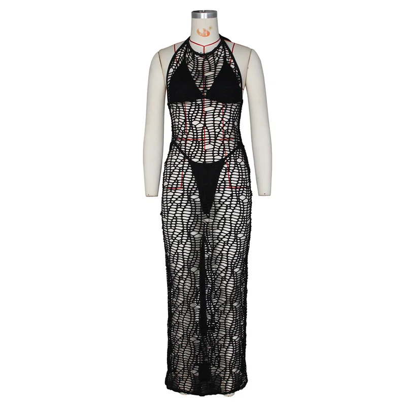 Women 3 Pieces Sexy Beach Bikini Set Backless Hollow Out Hole Knit Long Dress Cover Up+Lace Up Halter Bra Top+Underwear Swimsuit