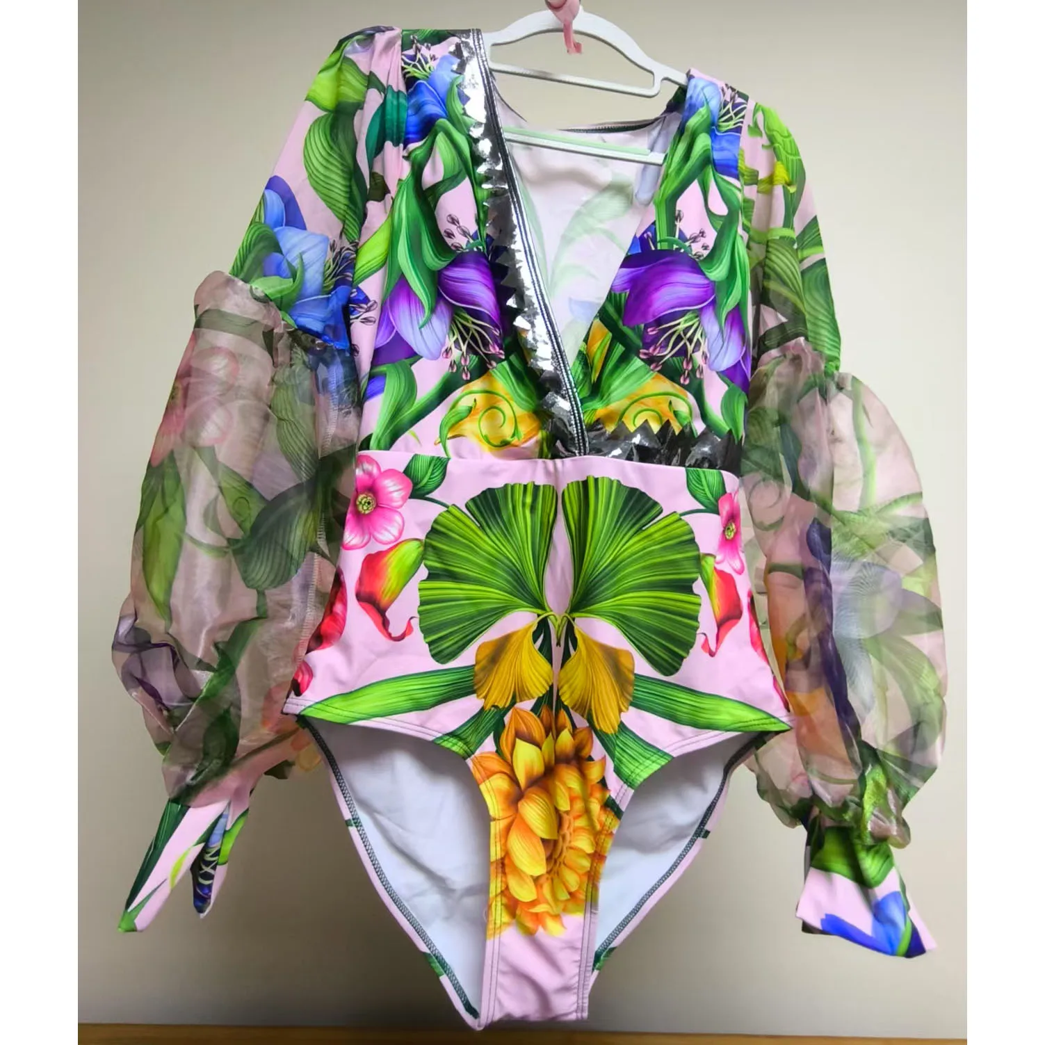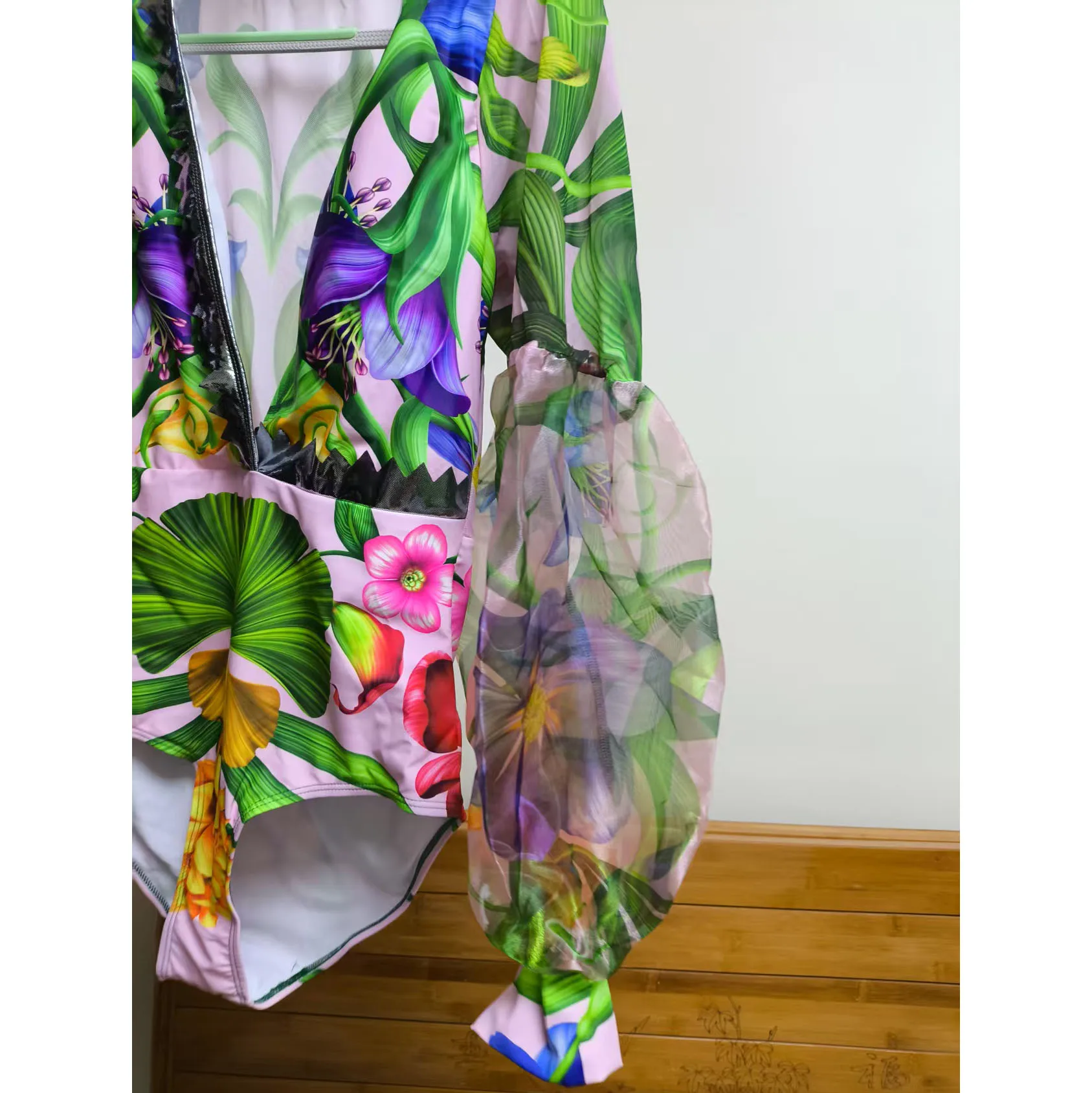 Women Swimwear V-neck long-sleeved Swimsuit Two-piece set Summer Print Bodysuit Bikini Set Beach Style Wear Maxi Dress Skirt